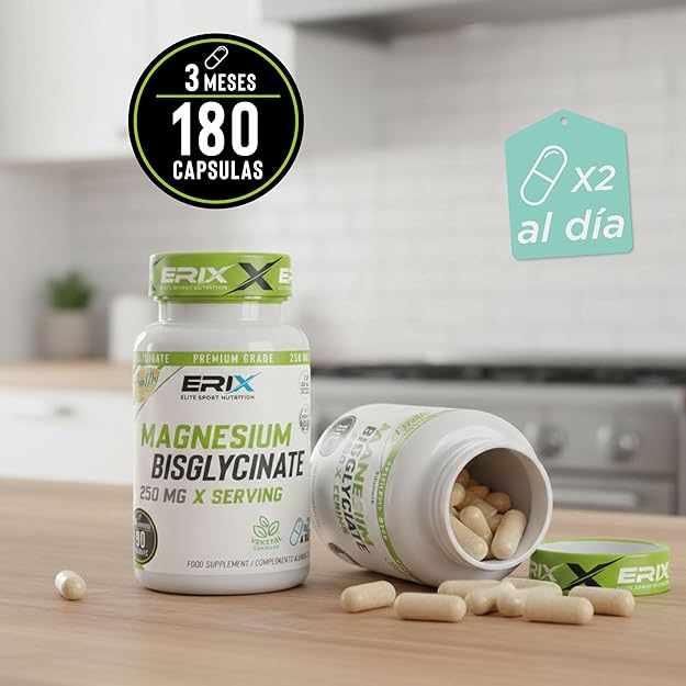 Este suplemento alimenticio de Erix Nutrición, aporta magnesio y presenta unas cualidades altamente beneficiosas, gracias al enriquecimiento de su fórmula mejorada con dos moléculas de un aminoácido conocido como glicina.