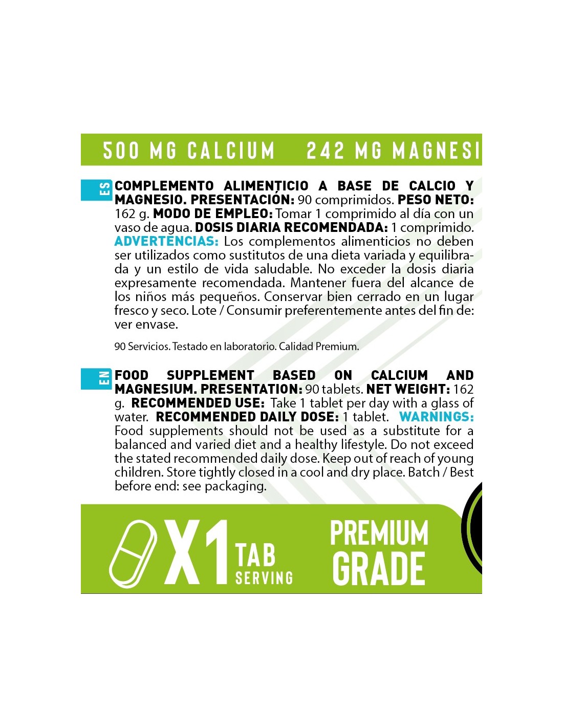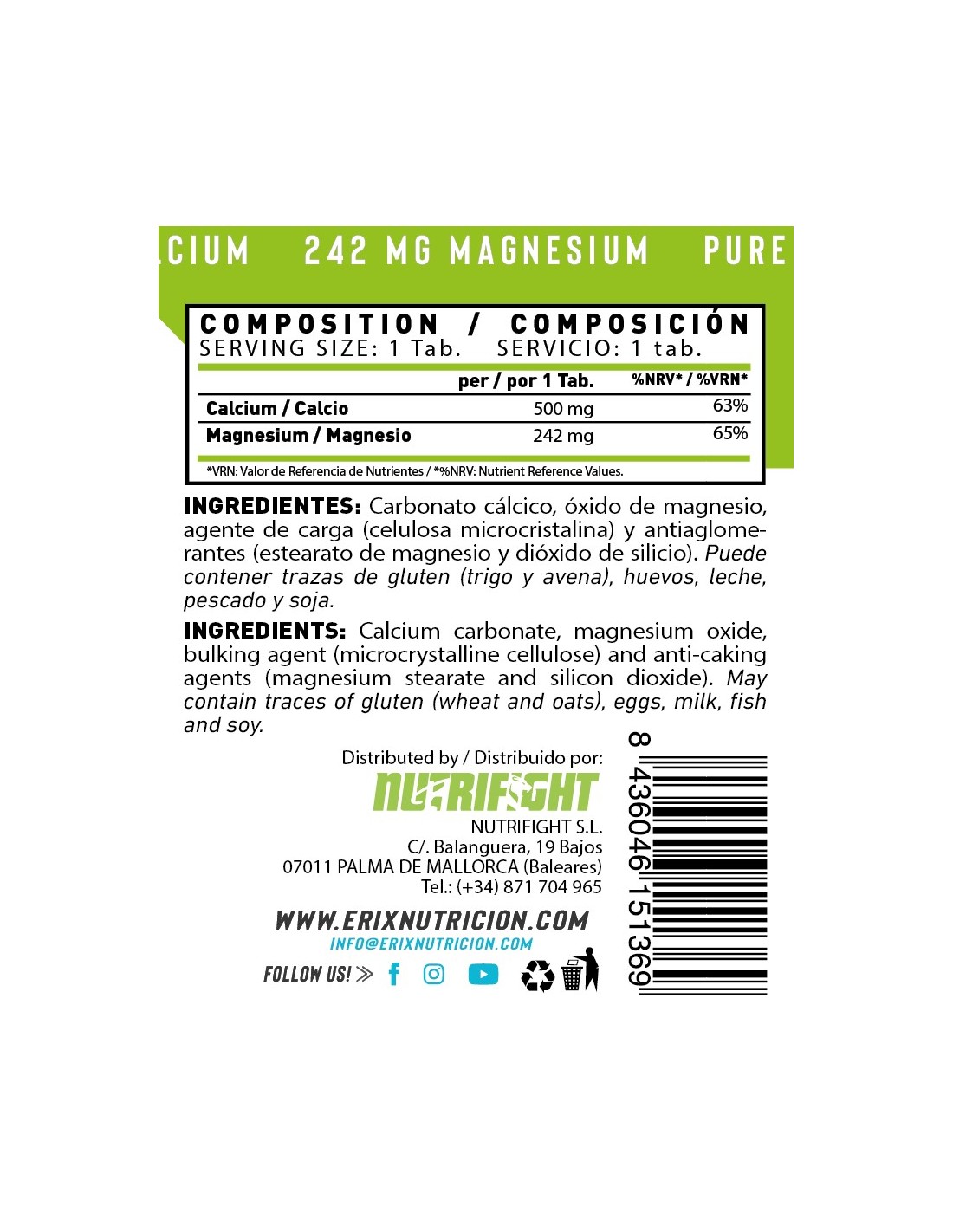 Ingredientes: Carbonato cálcico, óxido de magnesio, agente de carga (celulosa microcristalina) y antiaglomerantes (estearato de magnesio y dióxido de silicio). Puede contener trazas de gluten (trigo y avena), huevos, leche, pescado y soja Advertencias: Los complementos alimenticios no deben ser utilizados como sustitutos de una dieta variada y equilibrada y un estilo de vida saludable. No exceder la dosis diaria expresamente recomendada. Mantener fuera del alcance de los niños más pequeños. Conservar bien cerrado en un lugar fresco y seco