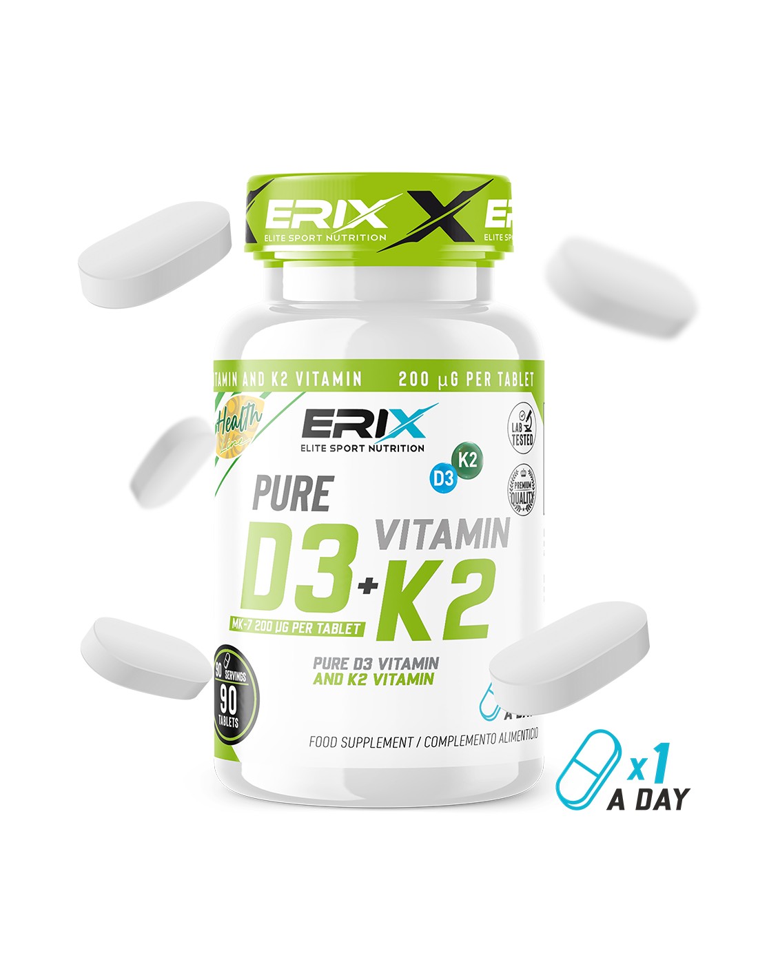 Vitamina D3+K2 de Erix nutrición es un suplemento en formato de 90 Tabletas el cual a sido diseñado para optimizar la acción sinérgica de estos dos componentes (la vitamina D3 y la vitamina K2) así conseguimos cubrir hasta un 1.000% de Vitamina D3 de la cantidad diaria recomendada.
