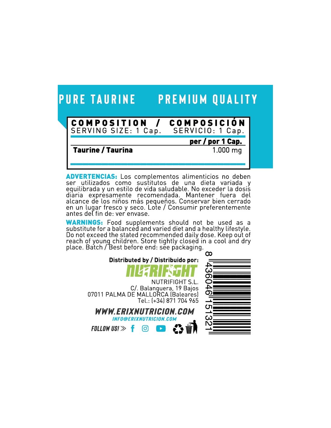 Taurine de Erix Nutrición es un suplemento a base de taurina, un aminoácido no esencial, que forma parte de nuestro organismo, y es el segundo, en forma libre, más abundante en el tejido muscular después de la glutamina.