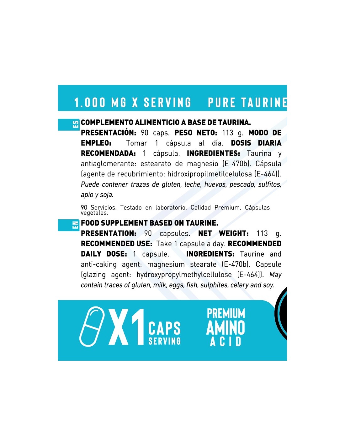 INGREDIENTES: Taurina y antiaglomerante: estearato de magnesio (E-470b). Cápsula (agente de recubrimiento: hidroxipropilmetilcelulosa (E-464)). Puede contener trazas de gluten, leche, huevos, pescado, sulfitos, apio y soja.