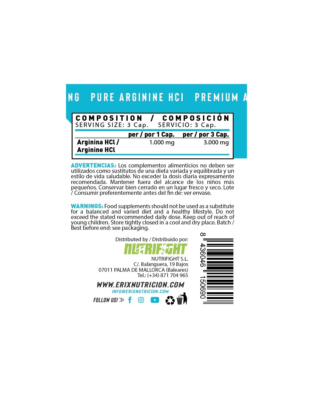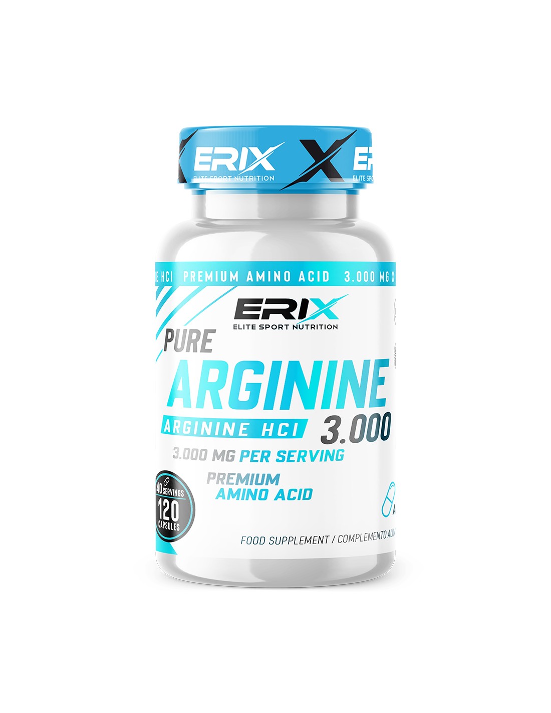 ARGININE 3.000 MG de Erix Nutrición son unas cápsulas que te traen 1000 mg de pura Arginina HCl por cápsula. Gracias a su contenido en Arginina HCl, ARGININE 3.000 MG de Erix Nutrición supone una suplementación importantísima en este aminoácido que te ayudará a lograr tus objetivos. Desde la estimulación inmunológica a la síntesis de creatina pasando por la disminución del colesterol o estimulando la liberación de hormona de crecimiento, ARGININE 3.000 MG de Erix Nutrición es el aliado perfecto para el deportista, facilitando su recuperación al retirar amoníaco de los músculos (residuo muscular del ejercicio anaeróbico) y convirtiéndolo en urea para así excretarlo de forma rápida. Complementa tu dieta con Erix Nutrición y ARGININE 3.000 MG y alcanza todos los objetivos que te propongas.