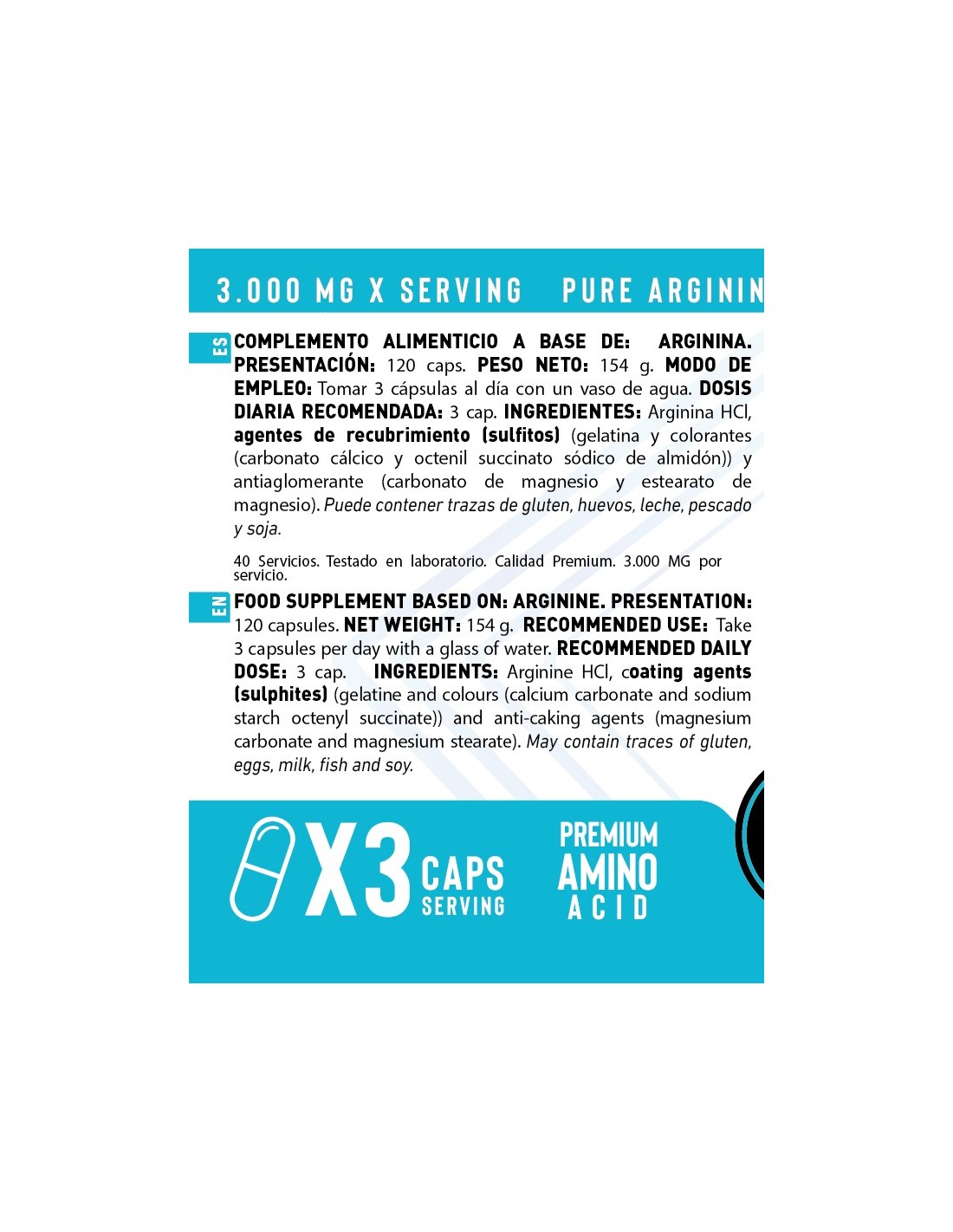 INGREDIENTES:  Arginina HCl, agentes de recubrimiento (sulfitos) (gelatina y colorantes (carbonato cálcico y octenil succinato sódico de almidón)) y antiaglomerante (carbonato de magnesio y estearato de magnesio). Puede contener trazas de gluten, huevos, leche, pescado y soja.