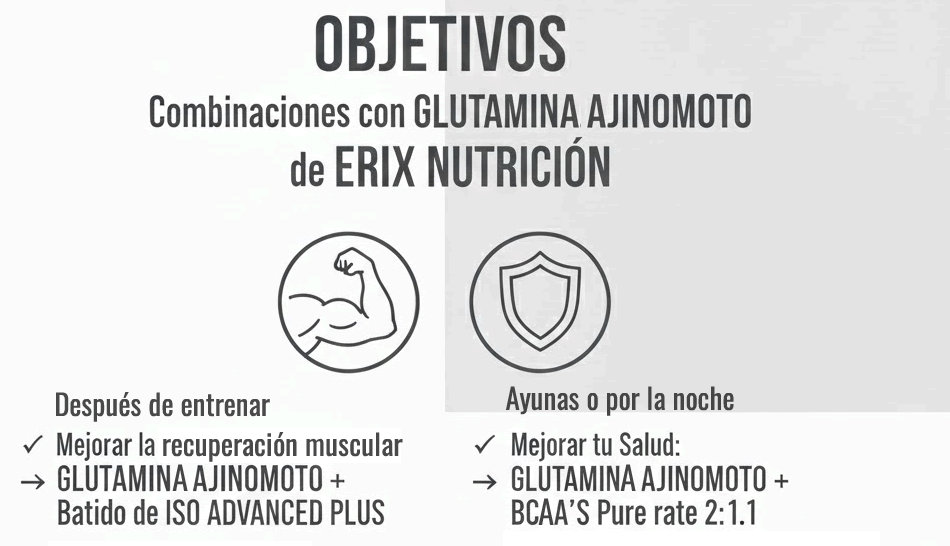 La glutamina es uno de los aminoácidos que intervienen en la formación de las proteínas, siendo el aminoácido más abundante en los grupos musculares. Pese a que se trata de un aminoácido no esencial (es decir, tu cuerpo puede sintetizarlo por sí mismo), su demanda por el organismo aumenta durante el estrés mental y físico y su producción disminuye con la edad. En ERIX NUTRICIÓN somos conscientes de este hecho, y por eso, con GLUTAMINE AJINOMOTO estarás aportando una fuente extra de L-Glutamina, para completar esta necesidad y evitar que la masa muscular disminuya como consecuencia del estrés oxidativo.