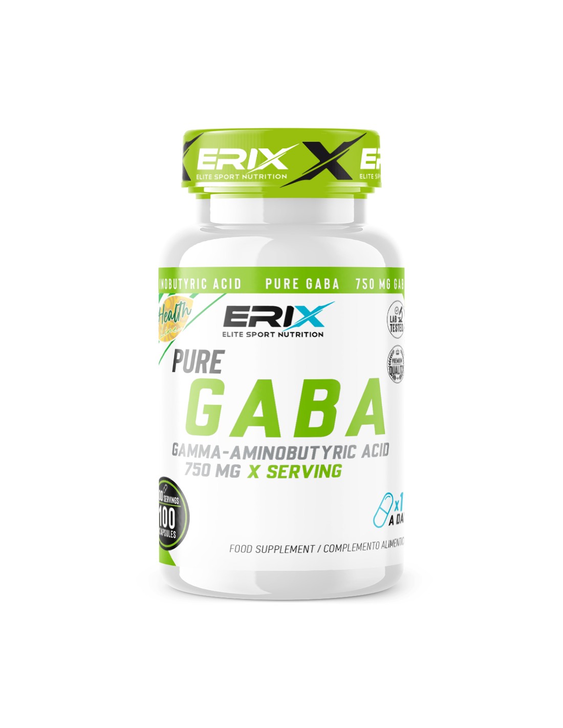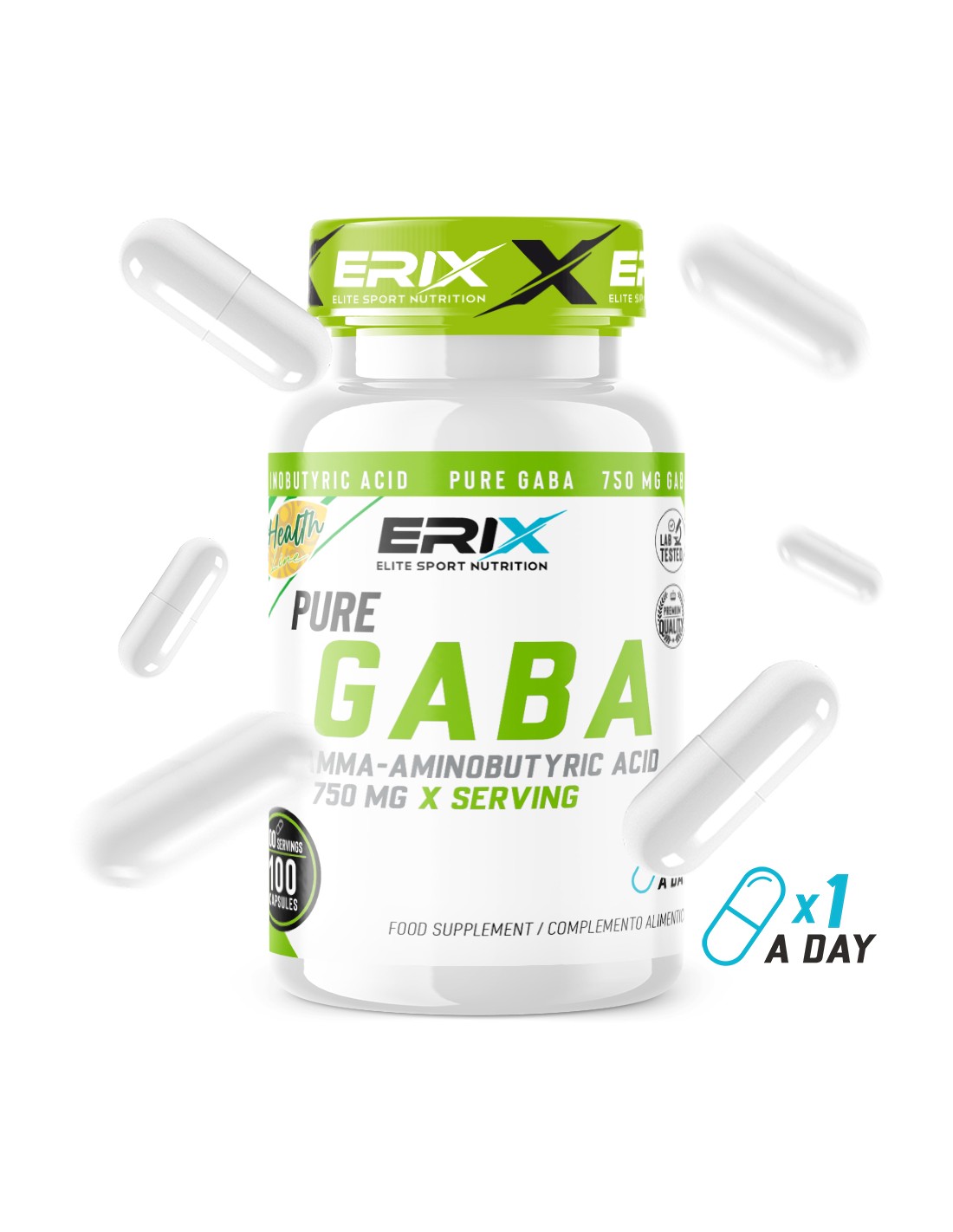 PURE GABA de ERIX NUTRICIÓN es un complemento alimenticio a base de Ácido Gamma-Aminobutírico (GABA), un aminoácido neurotransmisor, encargado de regular los estados de excitabilidad del cerebro. Este aminoácido está relacionado con la comunicación y el transporte de los impulsos nerviosos entre las neuronas. Su presencia en el interior del tejido nervioso asegura el equilibrio entre excitación e inhibición neuronal.