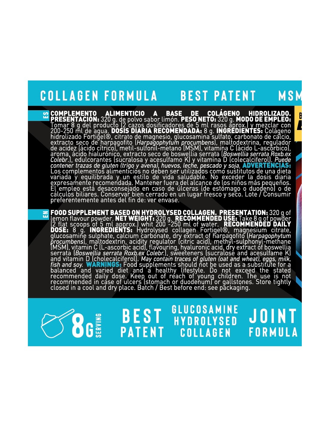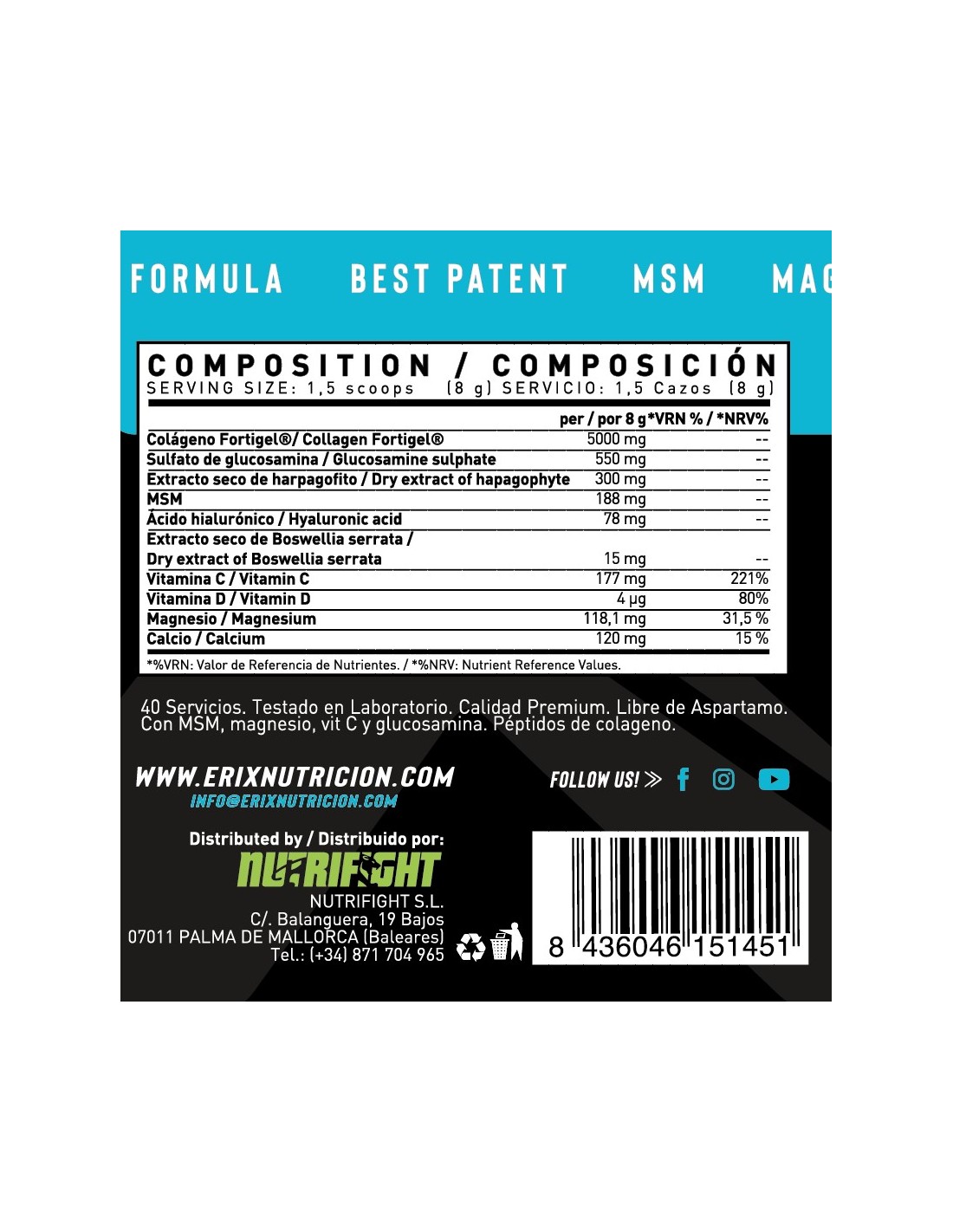 Ingredientes: Colágeno hidrolizado Fortigel®, citrato de magnesio, glucosamina sulfato, carbonato de calcio, extracto seco de harpagofito (Harpagophytum procumbens), maltodextrina, regulador de acidez (ácido cítrico), metil-sulfonil-metano (MSM), vitamina C (ácido L-ascórbico), aroma, ácido hialurónico, extracto seco de boswellia serrata (Boswellia serrata Roxb.ex Colebr.), edulcorantes (sucralosa y acesulfame K) y vitamina D (colecalciferol). Puede contener trazas de gluten (trigo y avena), huevos, leche, pescado y soja.