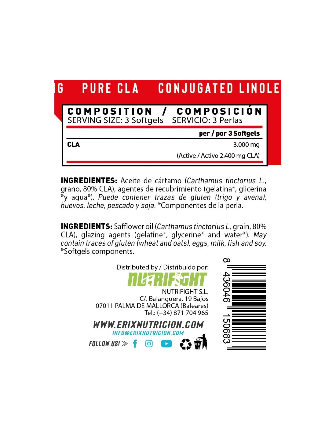 INGREDIENTES:  Aceite de cártamo (Carthamus tinctorius L., grano, 80% CLA), agentes de recubrimiento (gelatina*, glicerina *y agua*). Puede contener trazas de gluten (trigo y avena), huevos, leche, pescado y soja. *Componentes de la perla.