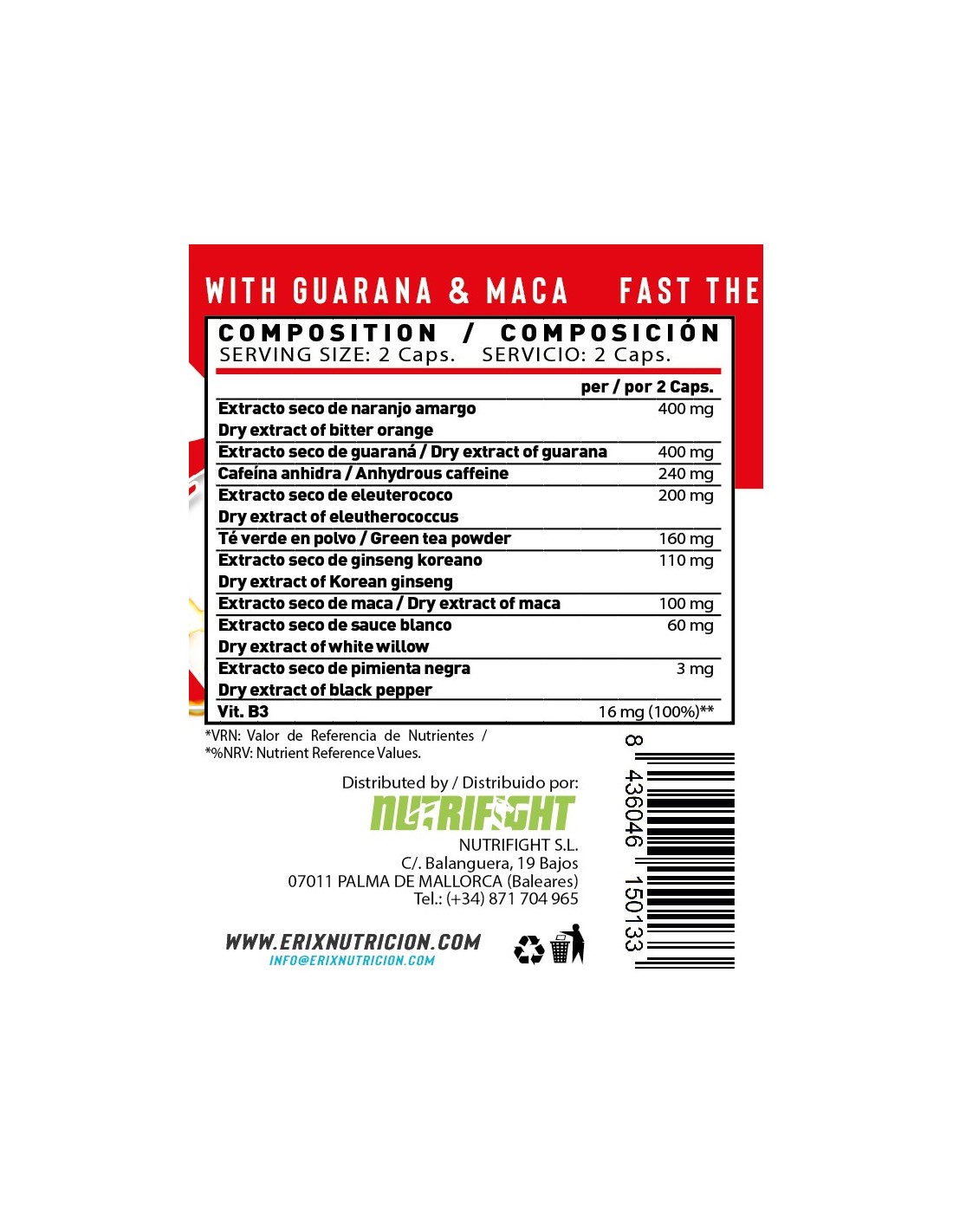 INGREDIENTES: Extracto seco de naranjo amargo (Citrus aurantium L.), extracto seco de guaraná (Paullinia cupana Kunth), agentes de recubrimiento (gelatina y colorante (dióxido de titanio)), cafeína anhidra, extracto seco de eleuterococo (Eleutherococcus senticosum Rupr. & Maxim.), té verde en polvo (Camellia sinensis L.Kuntze), extracto seco de ginseng koreano (Panax ginseng C.A.Mey), extracto seco de maca (Lepidium meyenii Walpers), extracto seco de sauce blanco (Salix alba L.), vitamina B3 (nicotinamida), antiaglomerante (estearato de magnesio) y extracto seco de pimienta negra (Piper nigrum L.). Contiene cafeína (240 mg por dosis diaria recomendada). No recomendado para niños ni mujeres embarazadas. Puede contener trazas de gluten, huevos, leche, pescado y soja.
