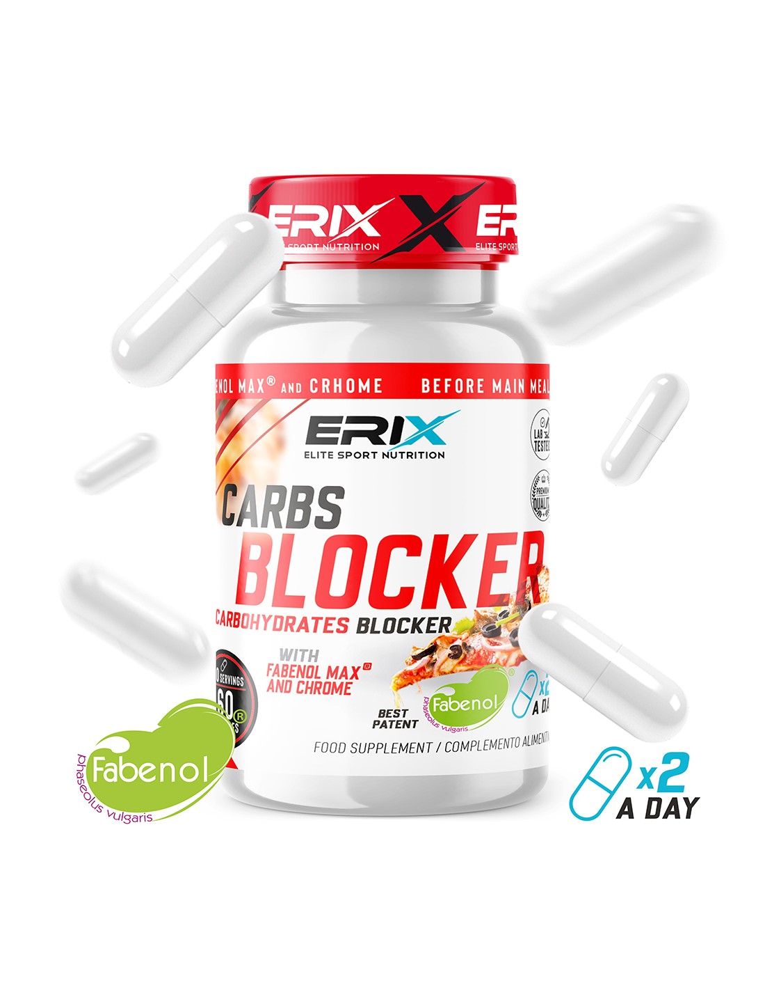 Carbs Blocker de Erix nutrición contiene Fabenol® y Cromo, extractos clínicamente probados que ayudan a bloquear los hidratos. Fabenol® es un potente bloqueador de carbohidratos a base de Phaseolus vulgaris. Estas semillas contienen un inhibidor de la alfa-amilasa que evita la actividad de metabolizar el almidón, por lo que también se la denomina como «bloqueador de almidón»