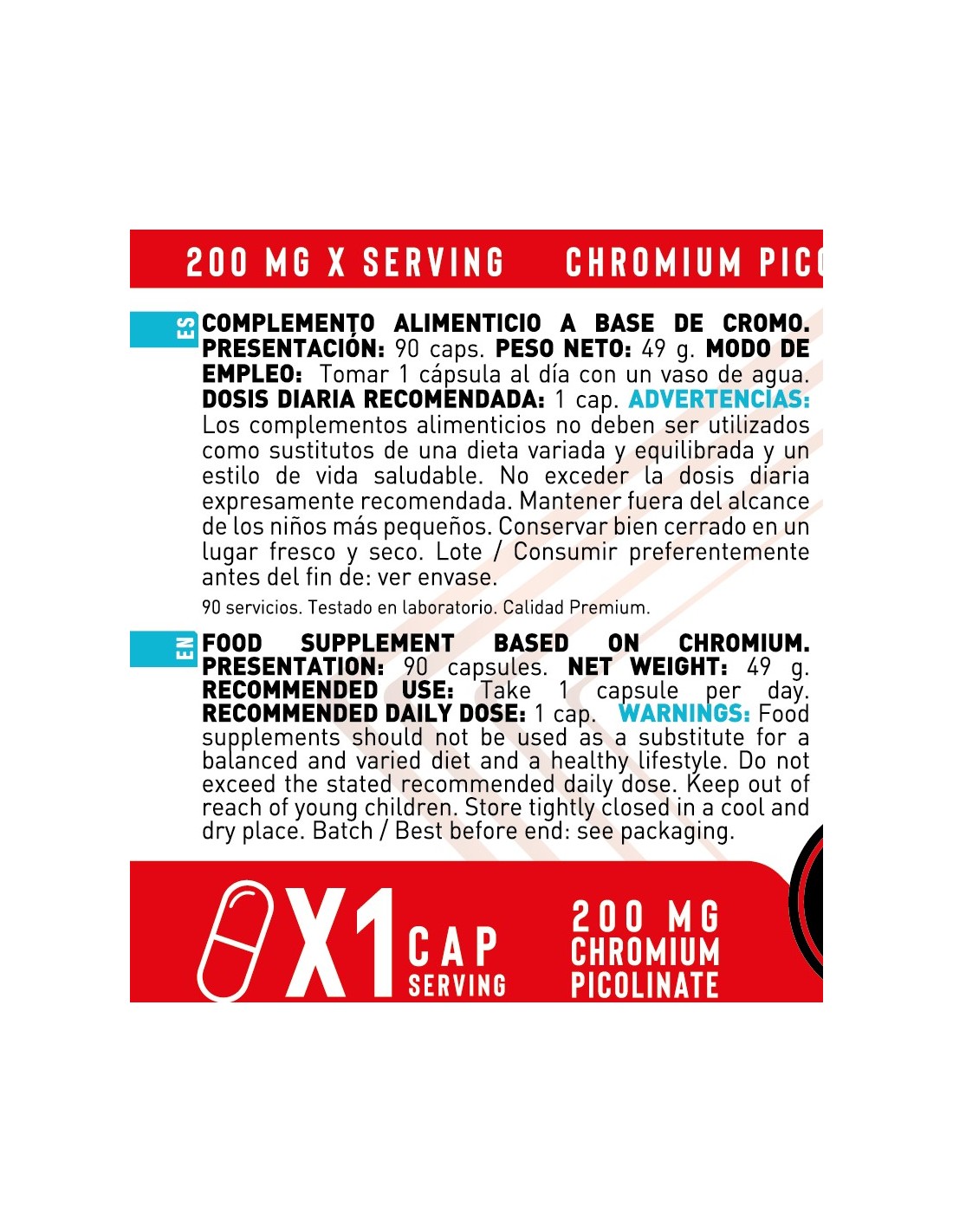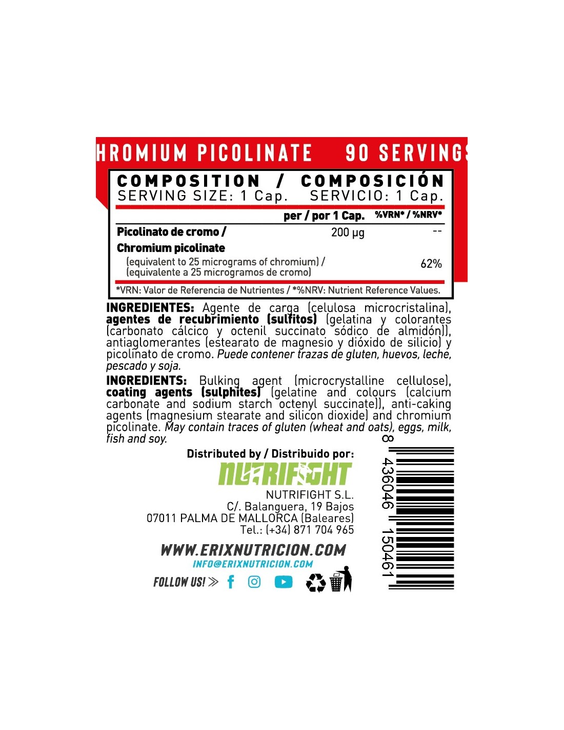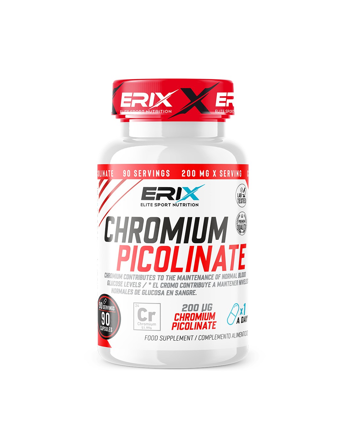 Las cápsulas de CHROMIUM PICOLINATE de ERIX NUTRICIÓN contienen 200 microgramos de picolinato de cromo como único ingrediente activo, proporcionándote un 62% del valor de referencia de cromo libre recomendado por la EFSA.