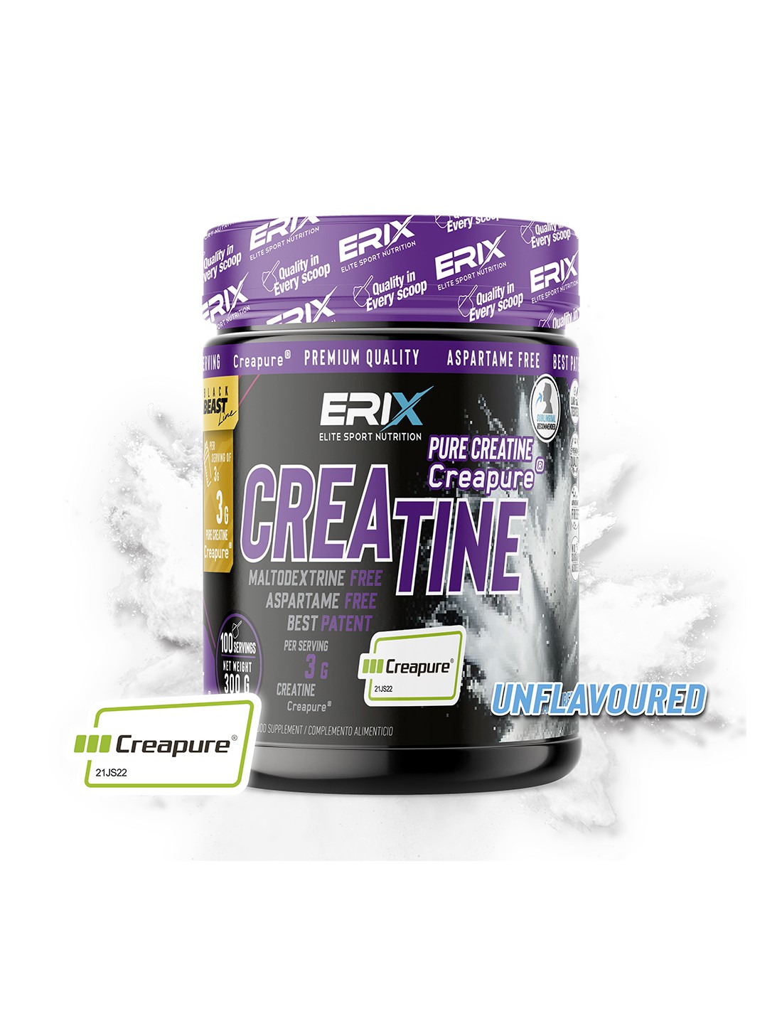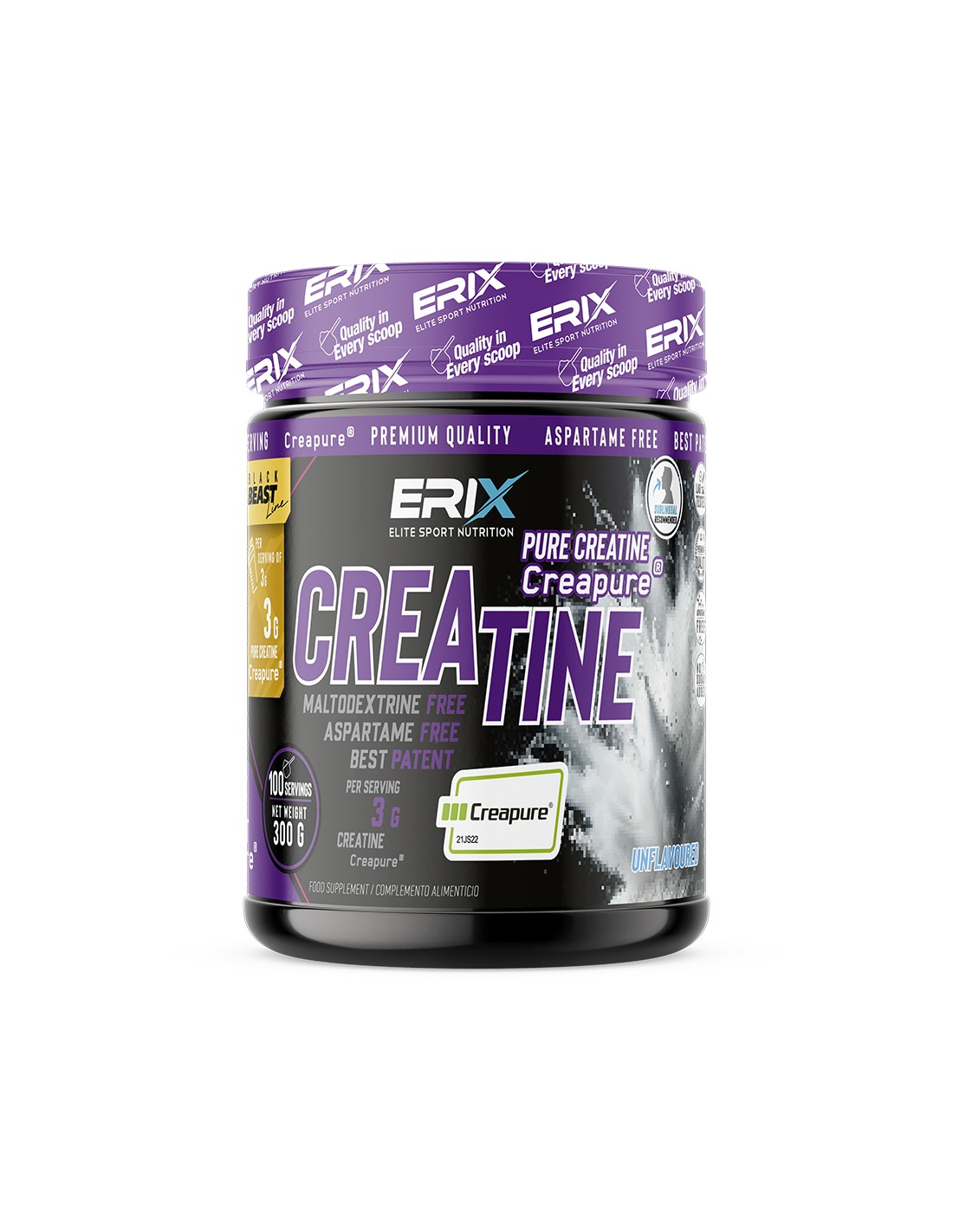 La Pure Creatina Creapure® de Erix Nutrición nos asegura un 99,8% de pureza gracias a Creapure®, la patente de creatina monohidrato con la más alta denominación de calidad, eficacia y seguridad.