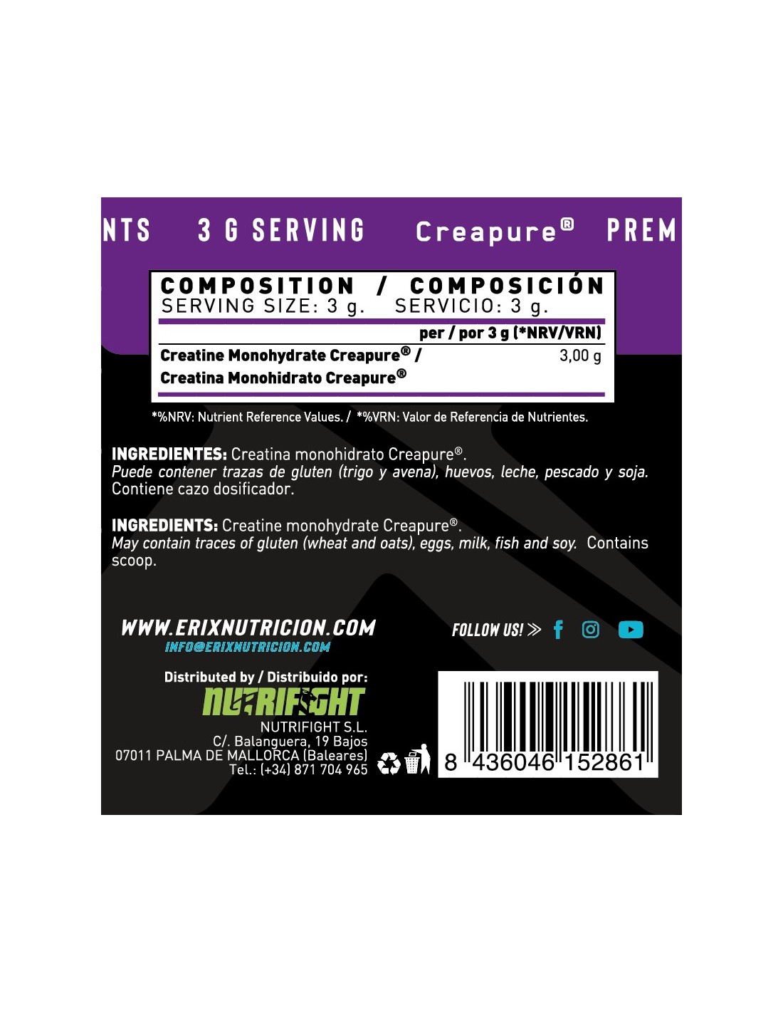 Creatina Monohidrato Creapure®. Puede contener trazas de gluten (trigo y avena), huevos, leche, pescado y soja.