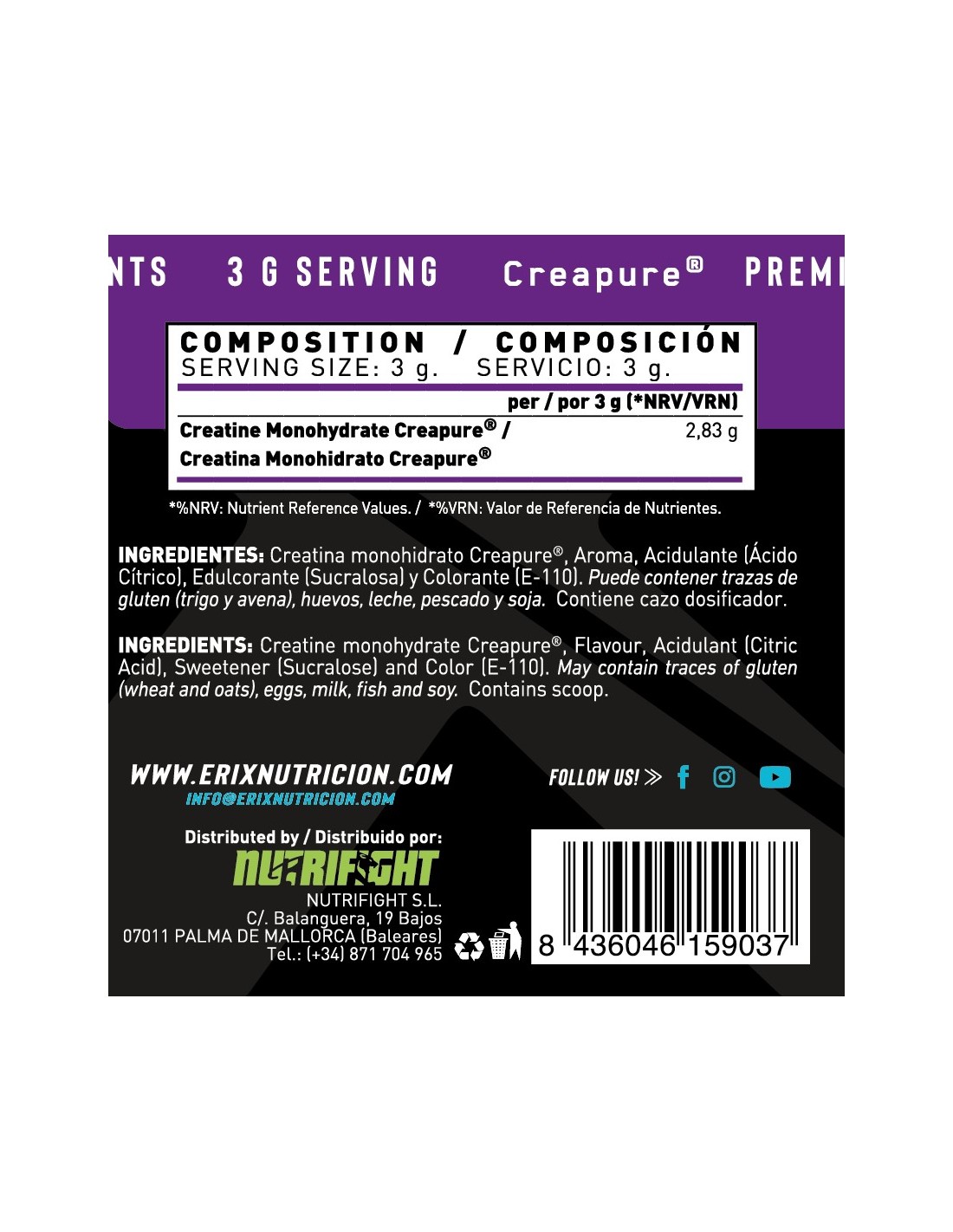 En Erix Nutrición hemos decidido formular una Creatina con los mayores estándares de pureza y calidad, siendo su ingrediente Creapure® y aromas. El sello Creapure® asegura que está fabricado con los mayores controles de calidad, proporcionando una creatina sin impurezas y de una calidad inigualable.