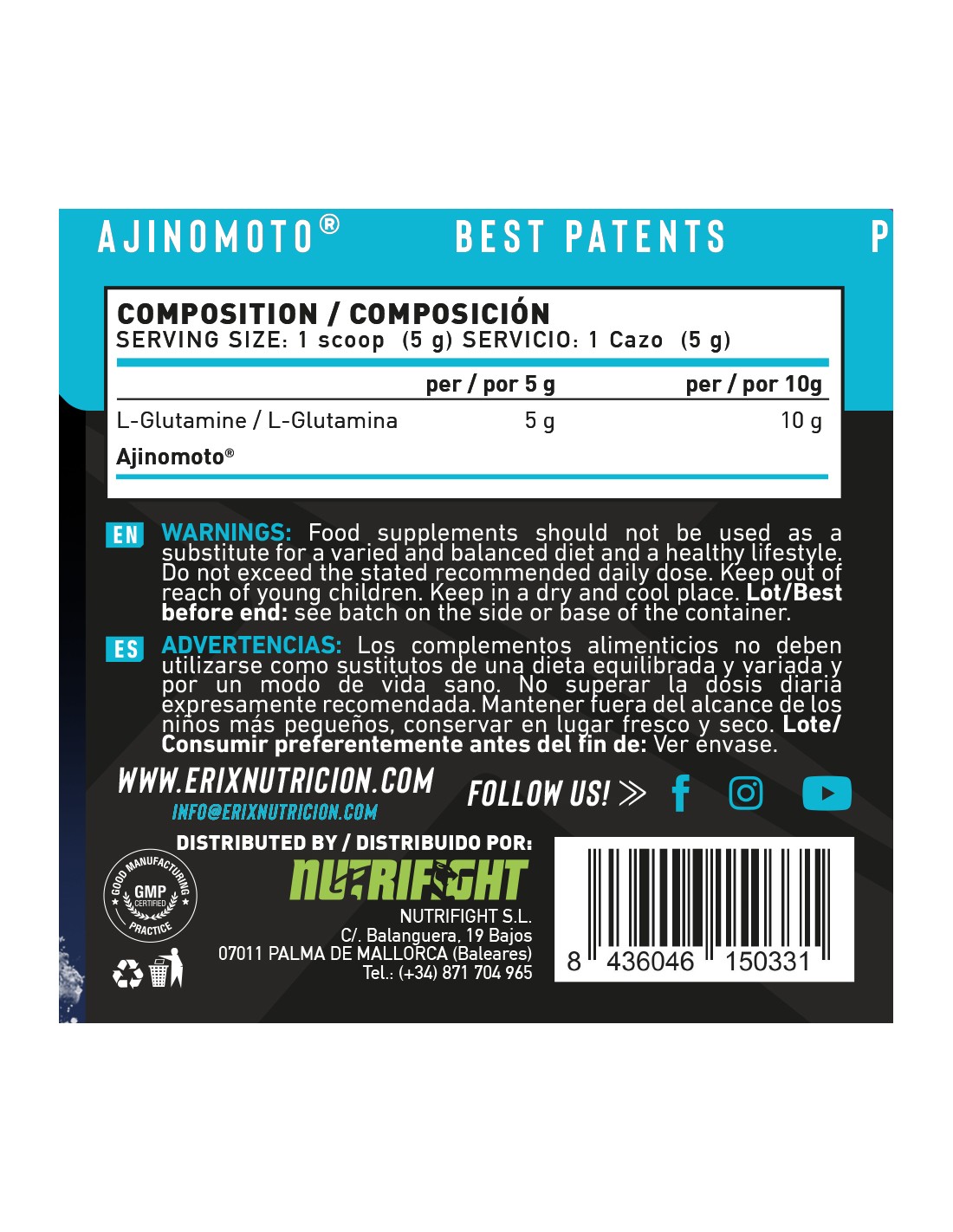 - Mejorar la recuperación muscular: Tomar GLUTAMINE AJINOMOTO de ERIX NUTRICIÓN + Batido de ISO ADVANCED PLUS después de entrenar.