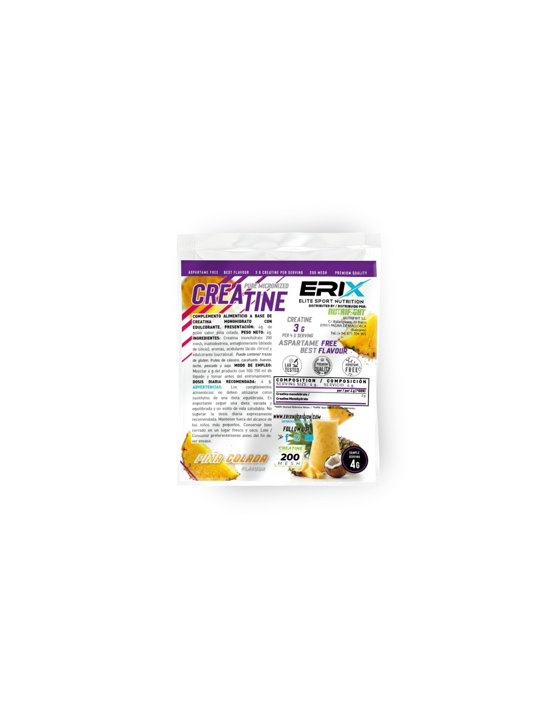 Pure Micronized Creatine de Erix Nutrición es 100% creatina monohidrato, sin aditivos, para obtener la dosis recomendada por la EFSA en una sola toma de 3 gramos, y sin aromas ni colorantes, lo que te permite tomarla sola o añadirla en batidos y preparados para completar tu alimentación.