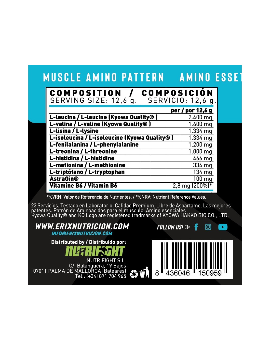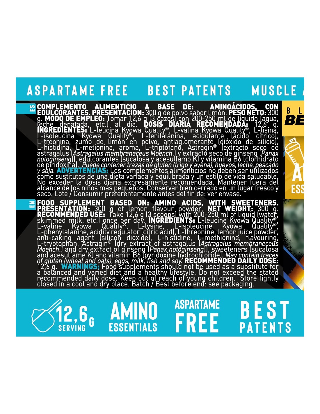 INGREDIENTES SABOR LIMONADA: L-leucina Kyowa Quality®, L-valina Kyowa Quality®, L-lisina, L-isoleucina Kyowa Quality®, L-fenilalanina, acidulante (ácido cítrico), L-treonina, zumo de limón en polvo, antiaglomerante (dióxido de silicio), L-histidina, L-metionina, aroma, L-triptófano, Astragin® (extracto seco de astragalus (Astragalus membranaceus Moench.) y extracto seco de ginseng (Panax notoginseng)), edulcorantes (sucalosa y acesulfamo K) y vitamina B6 (clorhidrato de piridoxina). Puede contener trazas de gluten (trigo y avena), huevos, leche, pescado y soja
