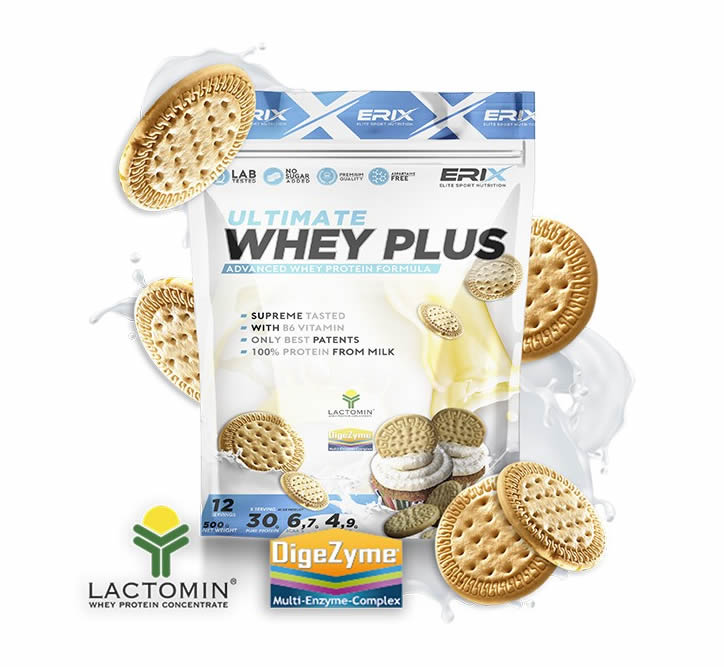 Su composición a base de 100% concentrado de proteína LACTOMIN® y nuestras combinaciones de sabores hacen de la WHEY PLUS ULTIMATE de ERIX NUTRICIÓN el complemento ideal para tu día a día.