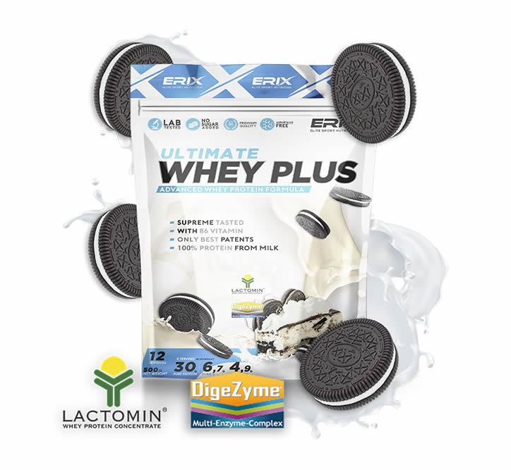 Su composición a base de 100% concentrado de proteína LACTOMIN® y nuestras combinaciones de sabores hacen de la WHEY PLUS ULTIMATE de ERIX NUTRICIÓN el complemento ideal para tu día a día.
