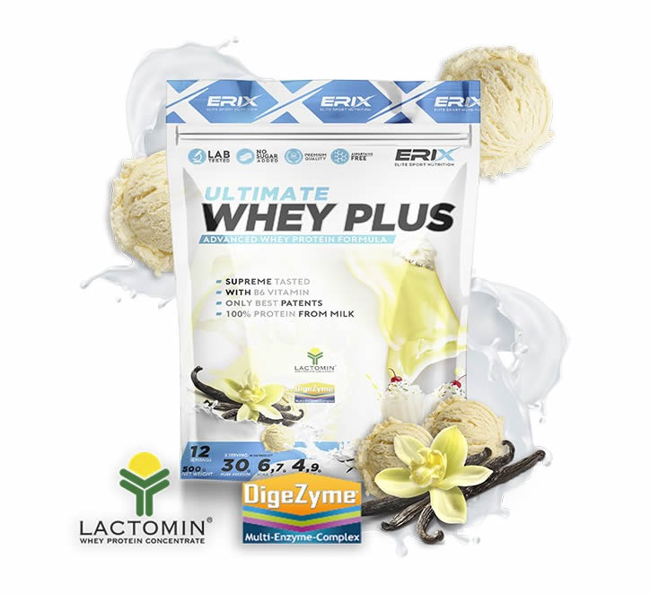 Su composición a base de 100% concentrado de proteína LACTOMIN® y nuestras combinaciones de sabores hacen de la WHEY PLUS ULTIMATE de ERIX NUTRICIÓN el complemento ideal para tu día a día.