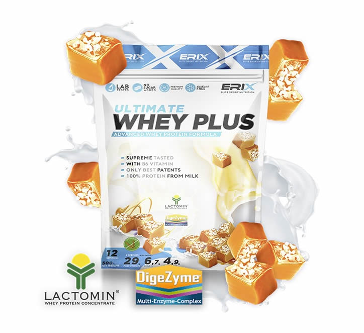 Su composición a base de 100% concentrado de proteína LACTOMIN® y nuestras combinaciones de sabores hacen de la WHEY PLUS ULTIMATE de ERIX NUTRICIÓN el complemento ideal para tu día a día.