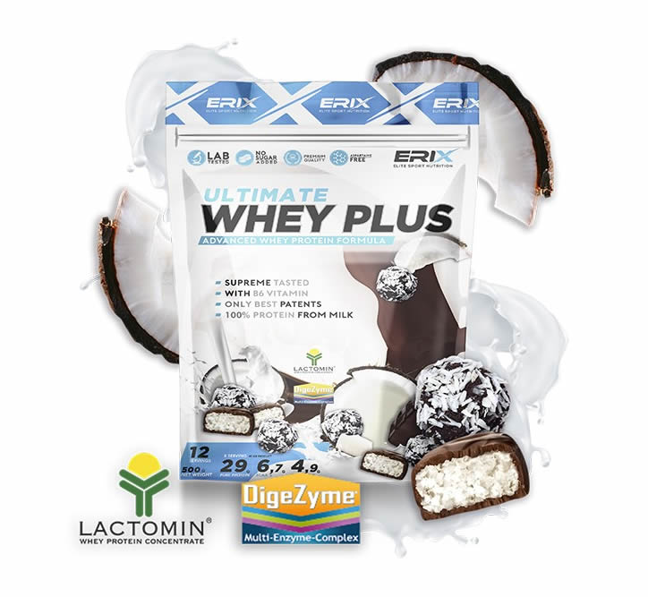 Su composición a base de 100% concentrado de proteína LACTOMIN® y nuestras combinaciones de sabores hacen de la WHEY PLUS ULTIMATE de ERIX NUTRICIÓN el complemento ideal para tu día a día.