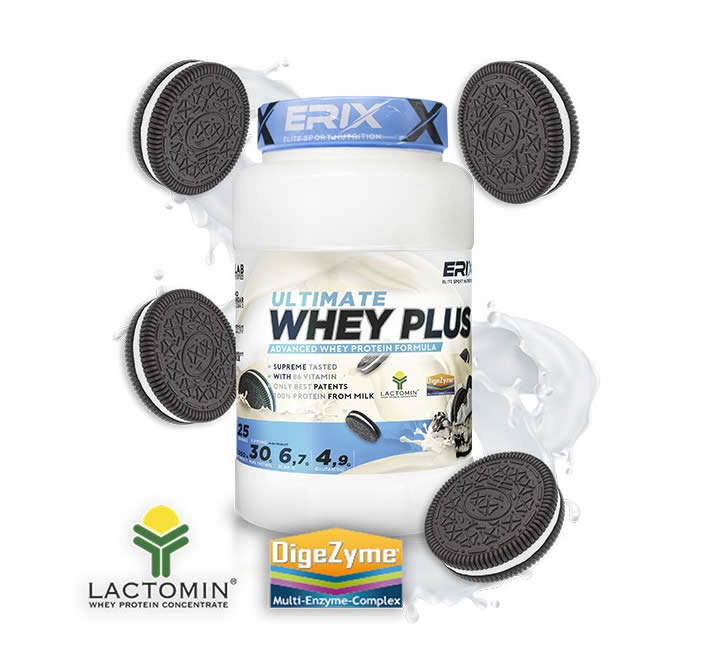 Su composición a base de 100% concentrado de proteína LACTOMIN® y nuestras combinaciones de sabores hacen de la WHEY PLUS ULTIMATE de ERIX NUTRICIÓN el complemento ideal para tu día a día.
