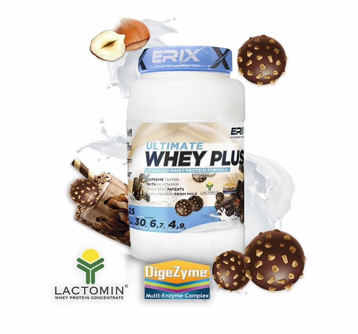 Su composición a base de 100% concentrado de proteína LACTOMIN® y nuestras combinaciones de sabores hacen de la WHEY PLUS ULTIMATE de ERIX NUTRICIÓN el complemento ideal para tu día a día.