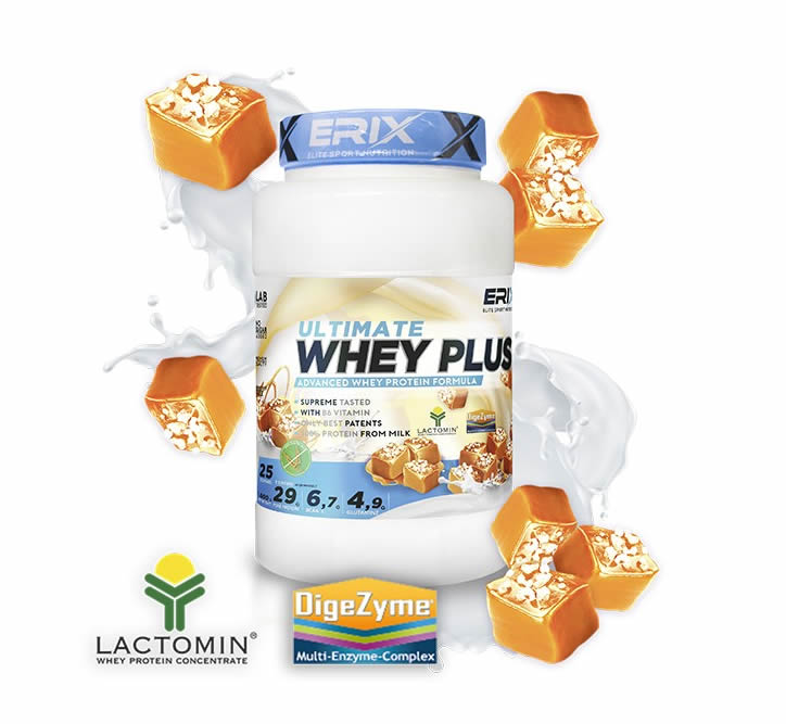 Su composición a base de 100% concentrado de proteína LACTOMIN® y nuestras combinaciones de sabores hacen de la WHEY PLUS ULTIMATE de ERIX NUTRICIÓN el complemento ideal para tu día a día.