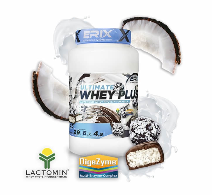 Su composición a base de 100% concentrado de proteína LACTOMIN® y nuestras combinaciones de sabores hacen de la WHEY PLUS ULTIMATE de ERIX NUTRICIÓN el complemento ideal para tu día a día.