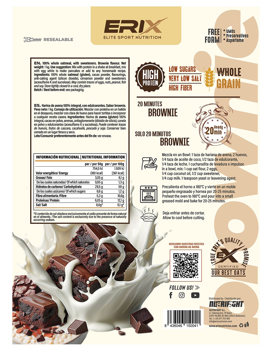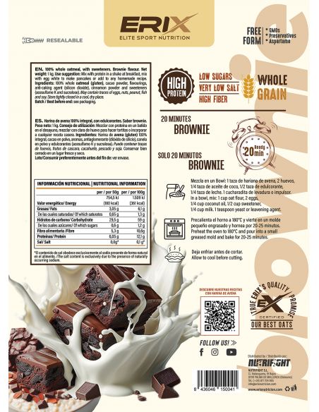 Si sumamos esto a su inigualable sabor, tenemos la combinación perfecta que te ayudará a cuidarte y a disfrutar de todas las recetas y preparados en los que utilices Instant Oat Flour de Erix nutrición.