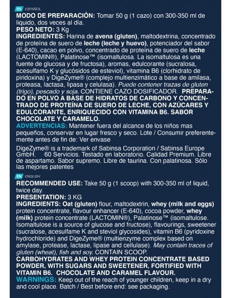 INGREDIENTES SABOR CHOCOLATE-CARAMELO: Harina de avena (gluten), maltodextrina, concentrado de proteína de suero de leche (leche y huevo), potenciador del sabor (E-640), cacao en polvo, concentrado de proteína de suero de leche (LACTOMIN®), PalatinoseTM (isomaltulosa. La isomaltulosa es una fuente de glucosa y de fructosa), aromas, edulcorante (sucralosa, acesulfamo K y glucósidos de esteviol), vitamina B6 (clorhidrato de piridoxina) y DigeZyme® (complejo multienzimático a base de amilasa, proteasa, lactasa, lipasa y celulasa). Puede contener trazas de gluten (trigo), pescado y soja.