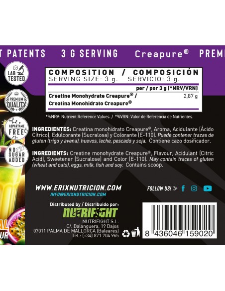 En Erix Nutrición hemos decidido formular una Creatina con los mayores estándares de pureza y calidad, siendo su ingrediente Creatina Creapure® y aromas. El sello Creapure® asegura que está fabricado con los mayores controles de calidad, proporcionando una creatina sin impurezas y de una calidad inigualable.