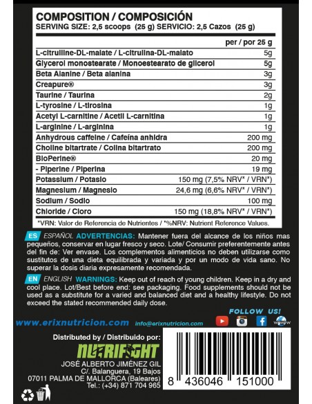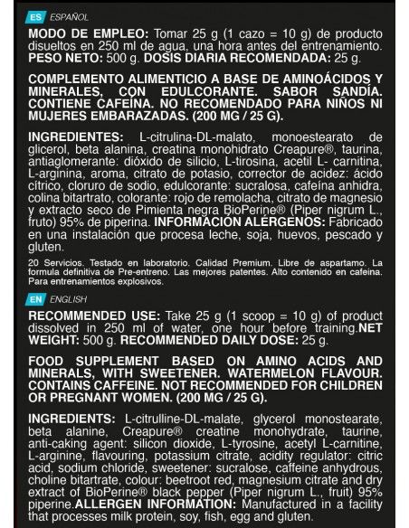 Aumenta el rendimiento y retrasa la aparición de fatiga: por medio de la conjunción concentrada de cafeína, beta alanina, taurina, vitamina B3, creatina, citrulina y arginina.
