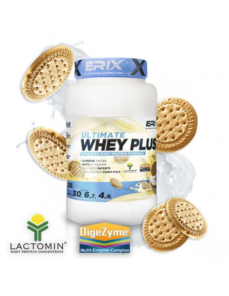 Su composición a base de 100% concentrado de proteína LACTOMIN® y nuestras combinaciones de sabores hacen de la WHEY PLUS ULTIMATE de ERIX NUTRICIÓN el complemento ideal para tu día a día.