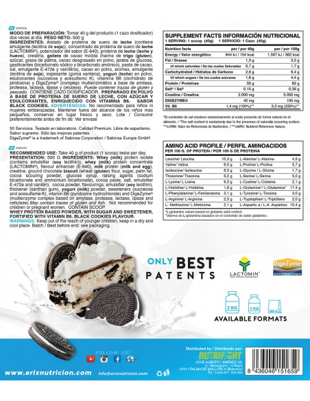 INGREDIENTES SABOR GALLETAS DE CHOCOLATE: Aislado de proteína de suero de leche (contiene emulgente (lecitina de soja)), concentrado de proteína de suero de leche (LACTOMIN®), potenciador del sabor (E-640), proteína de leche (leche y huevo), creatina, galleta de cacao molida (harina de trigo (gluten), azúcar, grasa de palma, cacao desgrasado en polvo, jarabe de glucosa, gasificantes (bicarbonato sódico y bicarbonato amónico), pasta de cacao, sal, emulgente E-472e y vainillina), cacao en polvo, aromas, emulgente (lecitina de soja), espesante (goma xantana), yogurt (leche) en polvo, edulcorantes (sucralosa y acesulfamo K), vitamina B6 (clorhidrato de piridoxina) y DigeZyme® (complejo multienzimático a base de amilasa, proteasa, lactasa, lipasa y celulasa). Puede contener trazas de gluten y pescado.