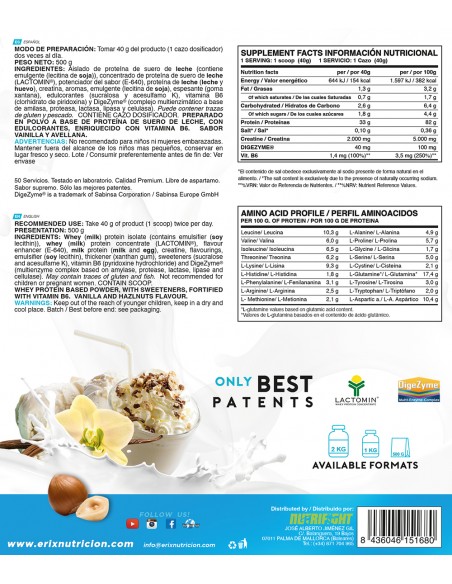INGREDIENTES SABOR VAINILLA-AVELLANA: Aislado de proteína de suero de leche (contiene emulgente (lecitina de soja)), concentrado de proteína de suero de leche (LACTOMIN®), potenciador del sabor (E-640), proteína de leche (leche y huevo), creatina, aromas, emulgente (lecitina de soja), espesante (goma xantana), edulcorantes (sucralosa y acesulfamo K), vitamina B6 (clorhidrato de piridoxina) y DigeZyme® (complejo multienzimático a base de amilasa, proteasa, lactasa, lipasa y celulasa). Puede contener trazas de gluten y pescado.