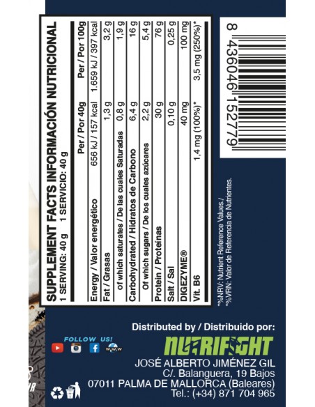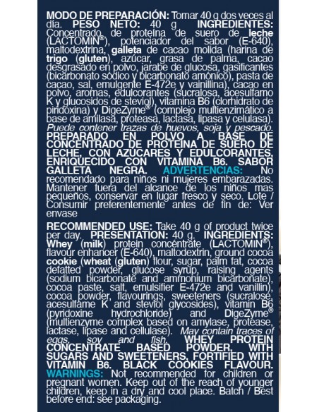 INGREDIENTES SABOR GALLETAS DE CHOCOLATE: Concentrado de proteína de suero de leche (LACTOMIN®), potenciador del sabor (E-640), maltodextrina, galleta de cacao molida (harina de trigo (gluten), azúcar, grasa de palma, cacao desgrasado en polvo, jarabe de glucosa, gasificantes (bicarbonato sódico y bicarbonato amónico), pasta de cacao, sal, emulgente E-472e y vainillina), cacao en polvo, aromas, edulcorantes (sucralosa, acesulfamo K y glucosidos de steviol), vitamina B6 (clorhidrato de piridoxina) y DigeZyme® (complejo multienzimático a base de amilasa, proteasa, lactasa, lipasa y celulasa). Puede contener trazas de huevos, soja y pescado.