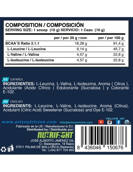INGREDIENTES: BCAA’s 2.1.1 (L-leucina, L-valina y L-isoleucina), agente de carga (celulosa microcristalina), antiaglomerantes (estearato de magnesio y dióxido de silicio) y vitamina B6 (clorhidrato de piridoxina). Puede contener trazas de gluten, huevos, leche, pescado y soja.