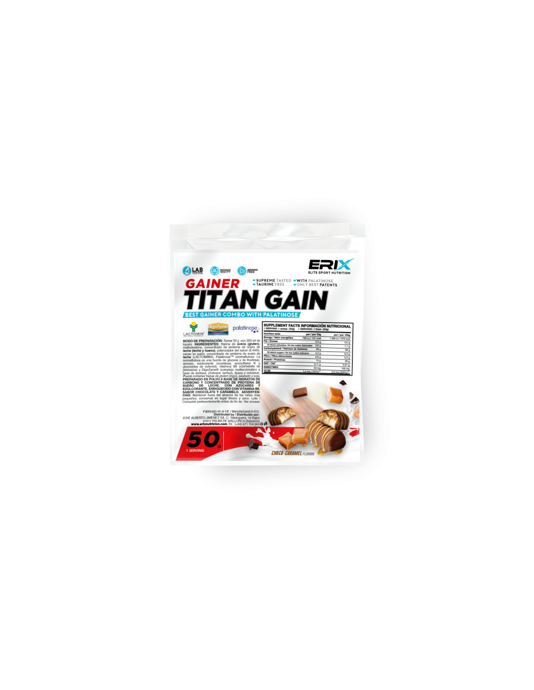 TITAN GAIN de ERIX NUTRICIÓN posee un 58% de carbohidratos, entre los que cabe destacar la harina de avena, 100% natural, con un alto contenido en fibra, la maltodextrina, 100% libre de azúcares, y la Palatinosa® (isomaltulosa), una fuente de glucosa y fructosa que genera un estímulo insulínico menor que el azúcar.