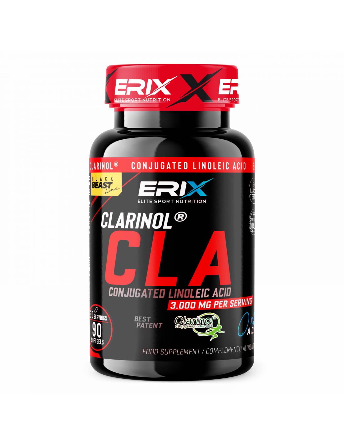 CLARINOL CLA de Erix Nutrición es el suplemento de ácido linoléico C.L.A. patentado, con la mayor calidad que existe en el mercado. El CLA tiene un efecto directo en el equilibrio entre los músculos y el índice de masa corporal (IMC) del cuerpo, contribuyendo a disminuir el porcentaje de grasa corporal y a aumentar la cantidad de tejido preservando la estructura muscular. Diversas investigaciones, han puesto de manifiesto otros efectos positivos del CLA: disminuyen la cantidad de triglicéridos en plasma y también el colesterol total, pudiendo así colaborar en la prevención de dolencias cardíacas, mejorando la función del sistema inmunitario y ayudando en las dietas de control de peso.