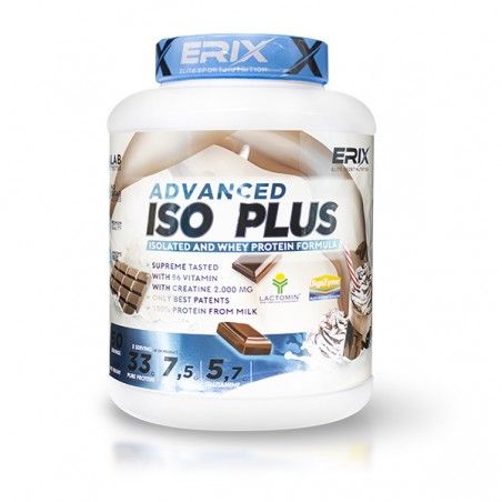 El consumo de proteínas es esencial para todas las personas, especialmente para aquellas activas y deportistas, ya que son indispensables para el mantenimiento y desarrollo de la masa muscular. ISO ADVANCED PLUS es una excelente fuente de proteínas obtenida 100% a partir de aislado de suero de leche y concentrado, perfecta no solo para tomar después del entrenamiento, sino también para consumir en el desayuno, la merienda o para cocinar todo tipo de recetas. De esta forma es el batido ideal para complementar el entrenamiento, ya que aporta alrededor de 30 gramos de proteína de máxima calidad por dosis, con un bajo aporte de carbohidratos y grasas, siendo perfecta para aquellos deportistas que se encuentren en periodos de definición.