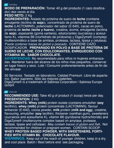 INGREDIENTES SABOR CHOCOLATE:  Aislado de proteína de suero de leche (contiene emulgente (lecitina de soja)), concentrado de proteína de suero de leche (LACTOMIN®), potenciador del sabor (E-640), cacao en polvo, proteína de leche (leche y huevo), creatina, aroma, emulgente (lecitina de soja), espesante (goma xantana), edulcorantes (sucralosa y acesulfamo K), vitamina B6 (clorhidrato de piridoxina) y DigeZyme® (complejo multienzimático a base de amilasa, proteasa, lactasa, lipasa y celulasa). Puede contener trazas de gluten y pescado.