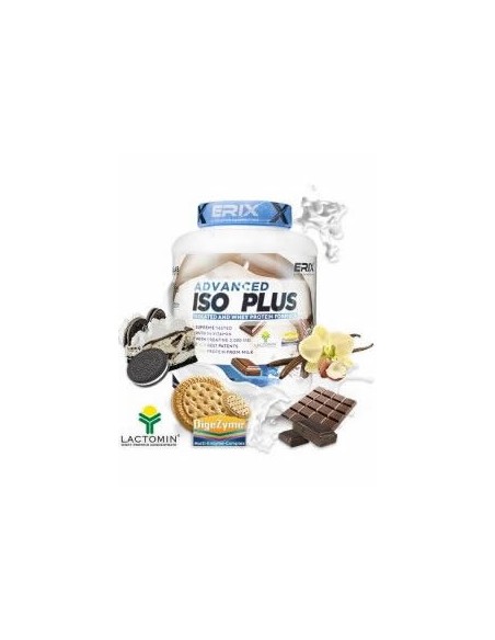 ISO ADVANCED PLUS una formula proteica enriquecida con vitaminas, creatina, aminoácidos para una total recuperación muscular. Disponible en 4 deliciosos y nutritivos sabores: vainilla con avellana, chocolate, oreo y cookies.